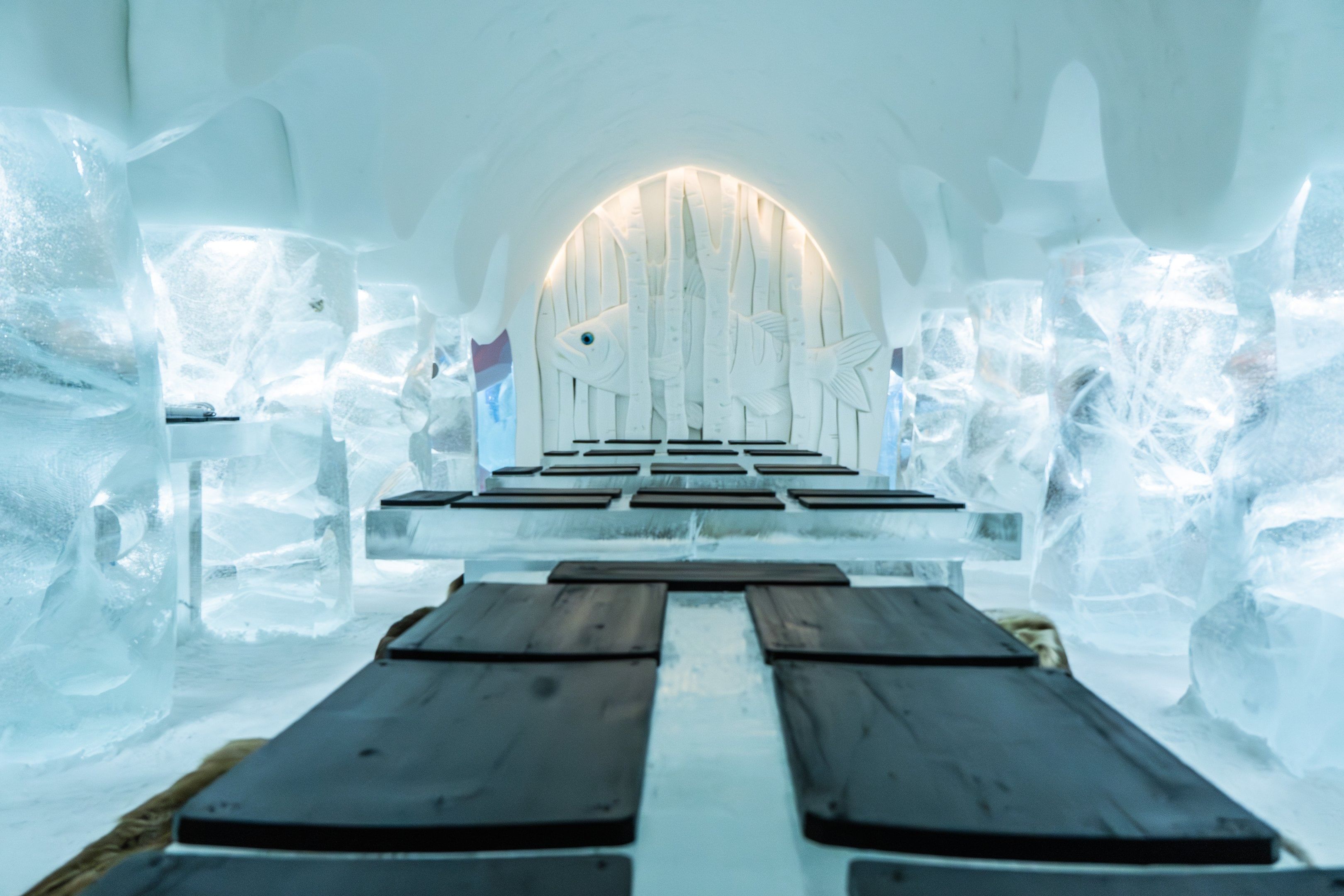 The Ice Restaurant built of snow and ice provides a unique setting for an unforgettable dinner serving up hot Lappish delicacies savoured around ice tables. The culinary enjoyment starts with a velvety forest mushroom soup, and is finished off with the SnowHotel's soft raspberry-vanilla bavaroise.