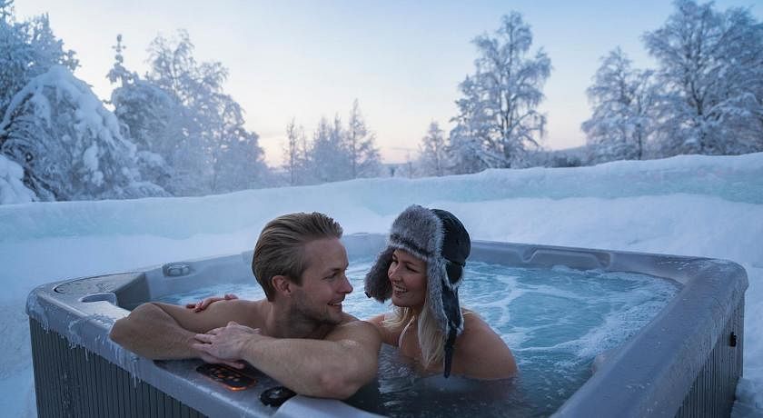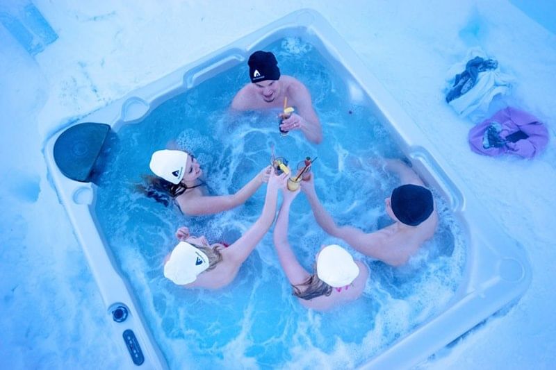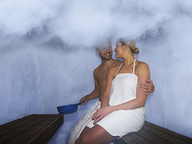 Relax in the cold warmth: an astonishing combination of thick warm steam with intimate snow walls